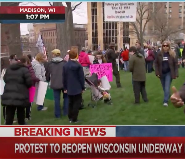 Wisconsin was one of several states, including Michigan, Illinois, Colorado, California, and Florida, where spoiled brats gathered for anti-lockdown Coronapaloozas. The Guardian received cell phone location data suggesting that participants likely traveled hundreds of miles to these astroturfed events. (How bored were they?) When the party's over, the protesters take their corona-tainted selves all across the state and even to neighboring ones.