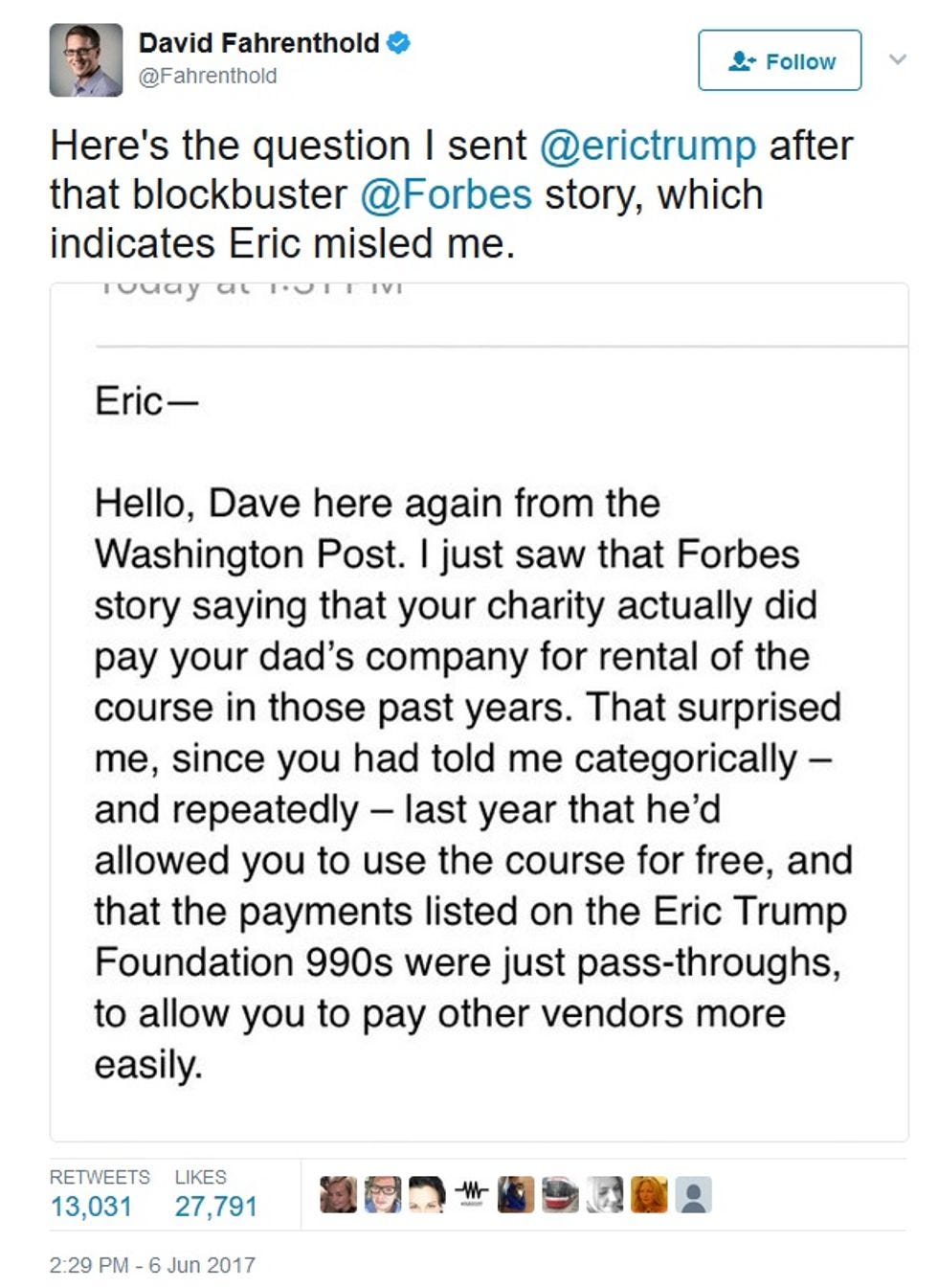 Speaking of the mean old media, David Fahrenthold, the Washington Post reporter who won a Pulitzer last year for his extensive digging into Donald Trump's scammy foundation, got on Twitter yesterday to say Eric Trump hadn't been exactly accurate about his foundation: