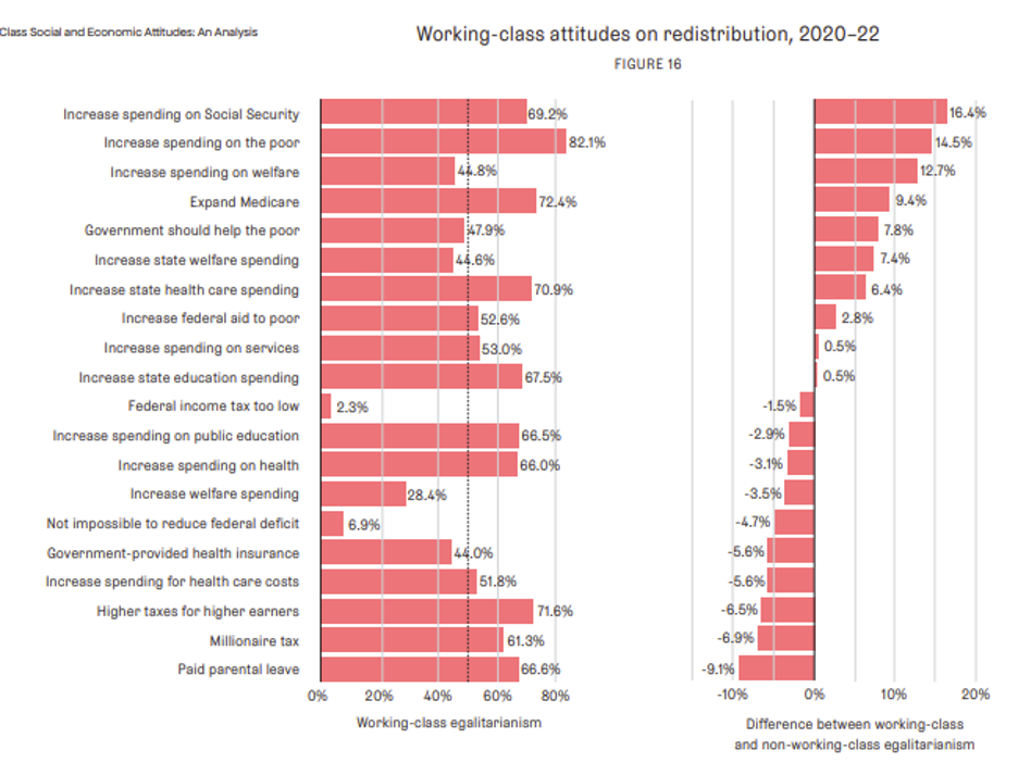 In fact, a recent study from Center for Working‑Class Politics and Jacobin has found that they are even more fond of some of them than non-working class people who consider themselves to be “egalitarians.”
