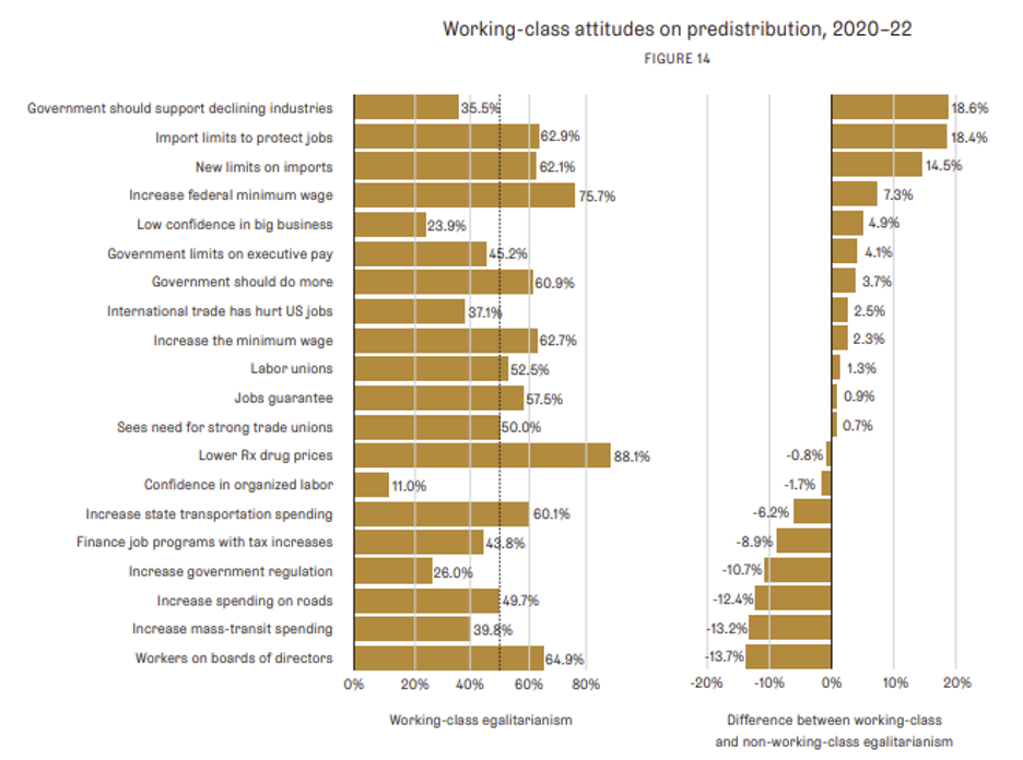 The results found that there is majority support among the working class for import limits to protect jobs, new limits on imports, increasing the federal minimum wage, belief that the government should do more, labor unions, a jobs guarantee, lower drug prices, increasing state transportation spending, and workers on boards of directors.