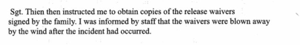 Here's deputy B. Cassidy's description of his attempt to locate the release forms: