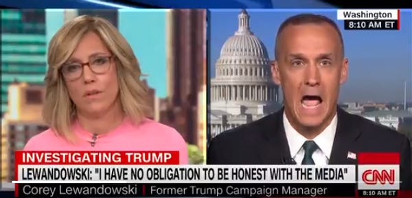 So Alisyn Camerota told Corey Lewandowski what was in the Mueller Report, he said she was being "disingenuous" (HA HA), she put on the screen the multiple instances detailed in the report that "scores of legal experts" agree constitute criminal obstruction of justice that any private citizen would be tried and convicted for, and she even helpfully noted the ones Lewandowski was personally involved in, which led Lewandowski to ask, innocently: