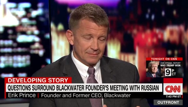 Way back in January, Erik Prince, the baby-faced Blackwater sadist who probably used to play Smear The Queer with Education Secretary Betsy DeVos, because of how they are sisters, went to the Seychelles as an "unofficial" representative of the Trump transition, for a meeting brokered by an Emirati sheik. The ostensible purpose? To set up some kind of weird back channel between Trump and Russia, somehow related to foreign policy in the Middle East.