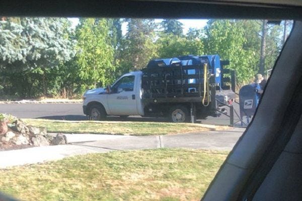Delaney noted in a follow-up tweet that he'd taken the photo August 8, and that nope, that mailbox wasn't being dropped off, it was being removed. Willamette Week did some assking around and was told by USPS spokesperson Ernie Swanson that the Postal Service "has removed four blue boxes from Portland, and 27 from Eugene." Which is already weird, since there are definitely more than four mailboxes in the back of that truck, in Portland.
