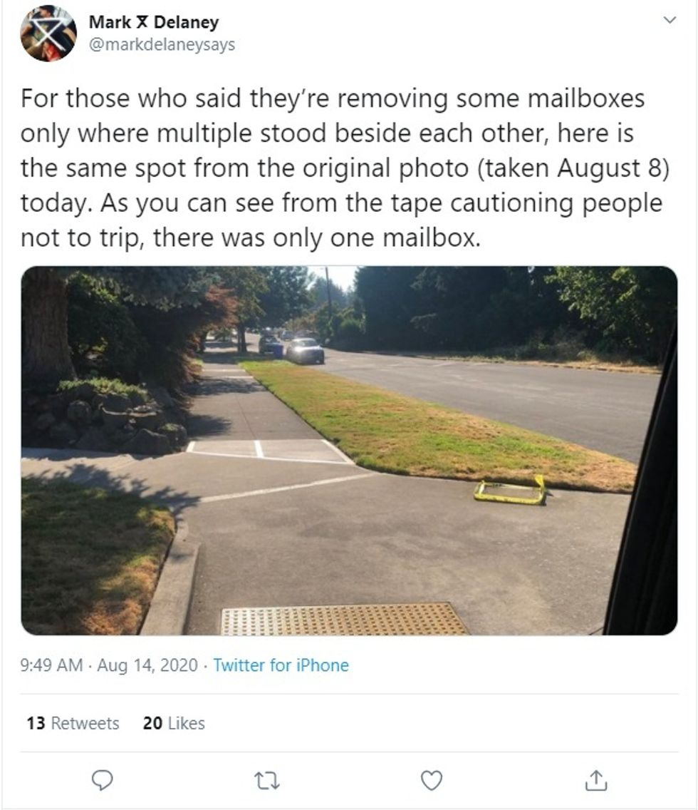 Delaney acknowledgedthat USPS has told media organizations that. BUT! When it comes to the truck with more than four mailboxes he photographed, "The problem is, the one being taken in my photo was by itself. The mystery continues."He alsoadded an update today, just in case anyone wanted to insist he must be making things up: Ain't no second mailbox left in place in that site: