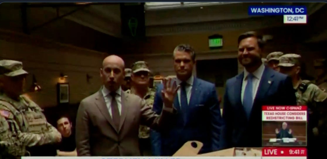Good morning, step right up and answer: What happens when JD Vance, Secretary Shitfaced Pete Hegseth, and Stephen Miller go out on the town in Washington DC during Donald Trump’s fascist Nazi crackdown? Are they greeted as liberators? Are they showered with praise and love and cum and panties? Do people throw couches at JD Vance’s head affectionately like furniture bukkake — BONK BONK BONK BONK BONK! — because they know the old scamp has been working so hard (except for his 800 vacations, including the one he just returned from) and they know he probably needs to take a load off (of his penis)?