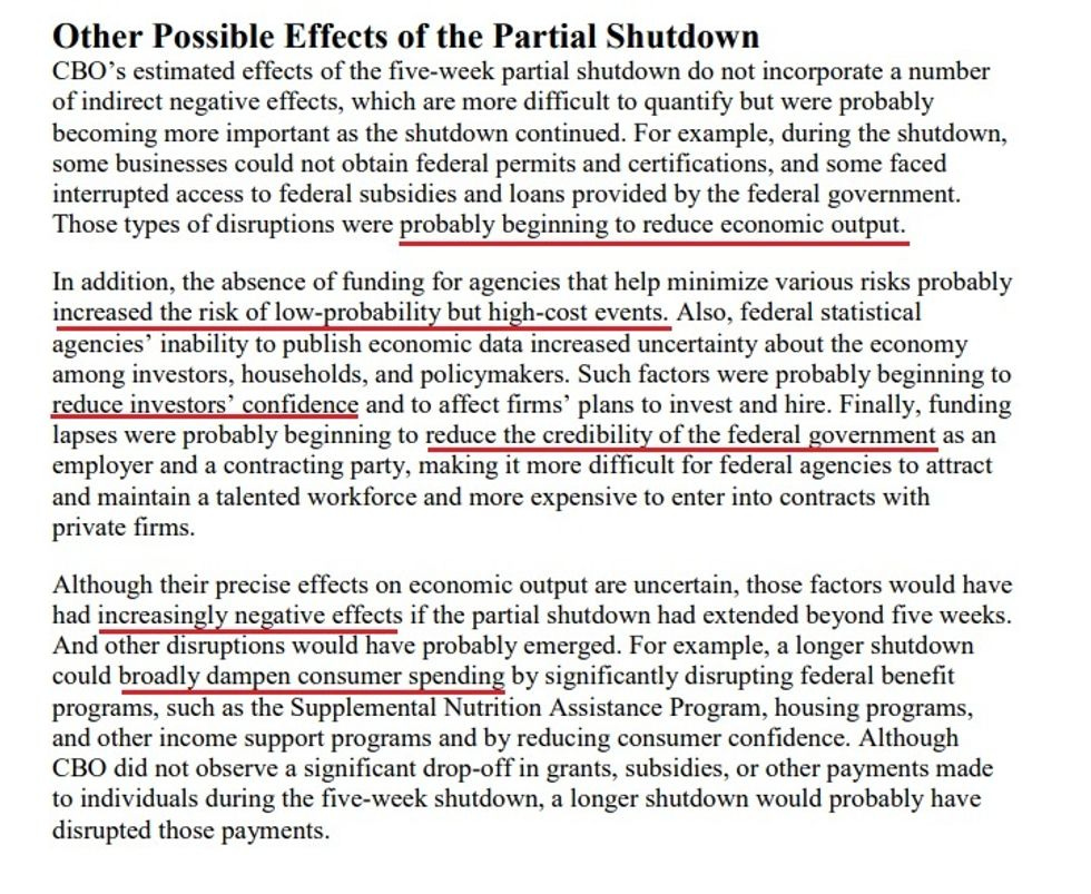 Another lesson of the longest government shutdown in history: It was bad enough as it was, but if you REALLY want to take hostages and fuck up the economy, your shutdown needs to last "months or years" like Trump originally wanted. Again and again the CBO report reminds us that serious follow-on economic effects (like the BEER CRISIS ) were starting to emerge as the shutdown continued, and they would only have gotten worse had the shutdown gone on longer. Here's a cheery excerpt from Page 11, with a bit of highlighting by Yr Wonkette:
