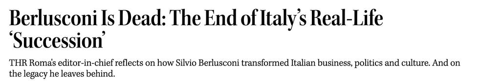 The sub-hed gushes, "He introduced sex and glamour to Italian TV and then brought the same formula to politics, dominating the country and its culture for more than 20 years."