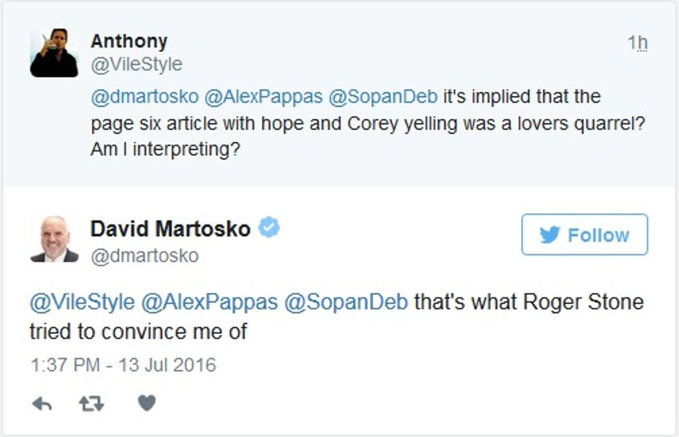 “God no,” Martosko responded. “Not since he tried to tell me Corey L. and Hope H. were secret lovers.”