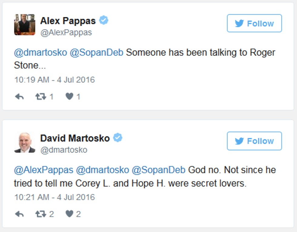 [E]arlier this month, The Daily Mail ‘s David Martosko revealed that former Trump staffer Roger Stone was also trying to spread rumors of an affair. Martosko was speculating about Trump’s choice of running mate, when The Daily Caller’s Alex Pappas asked him whether his source was Stone.