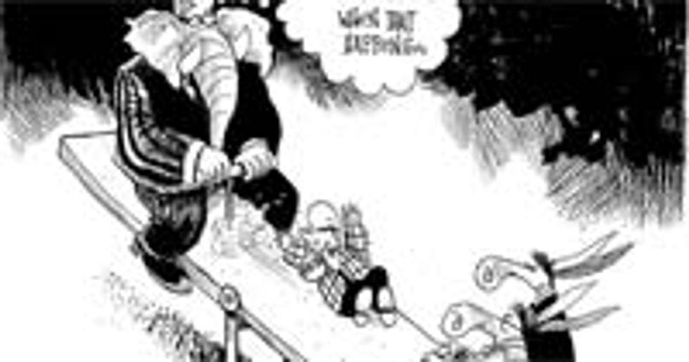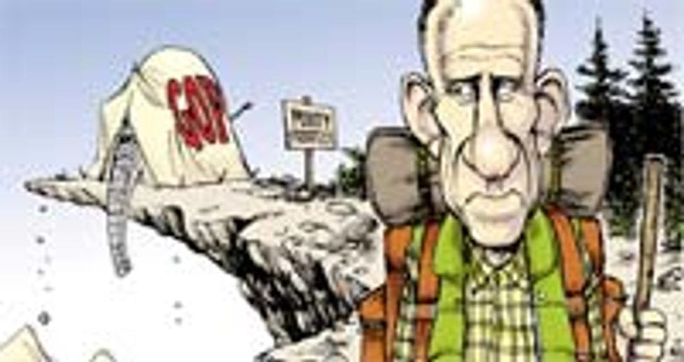 Even here, it's more like he's just casting a jaundiced eye on the obese, tent-clad elephant away from which he's hiking vigorously. And wouldn't you? We all know that the mighty GOP pachyderm-symbol, like the party he represents, has grabby hands (or a grabby trunk, maybe), and you wouldnotwant to spend a night in a tent with him. Also worth noting here is the attention Mr. Horsey has applied to the details of Specter's camping accoutrements, including his plaid shirt and down vest and walkin' stick. Kudos to you, sir! Unfortunately, your fellow members of the cartooning fraternity did not do as well.