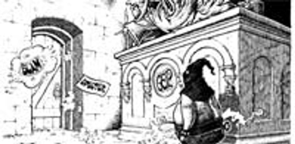 This cartoon manages to avoid drawing Specter at all, but in the process becomes tangled up in philosophical dilemmas about how a static image can represent the progression of time. Specifically, we see the awkward moment just after Specter fled the Senate Republican caucus's underground sex dungeon; how can we make clear the fact that it is our boy Arlen who has just slammed the door behind him? The solution arrived at here -- to have a random slip of paper labeled "Specter" sort of drifting in the air around the doorway -- is not, I am sorry to say, particularly elegant.