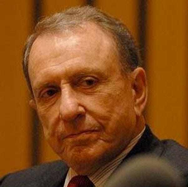 Now, your Cartoon Violence columnist is one of those terrible critics who is completely unskilled in the medium that he criticizes -- I can't draw a lick, to put it plainly. Nevertheless, Specter seems pretty caricaturable, am I right? It's the eyes, the beady, shifty eyes, that are, for me, his defining feature. They manage to simultaneously look melancholy and slightly pissy, as if he's very sad that the Warren Commission couldn't reveal the CIA-UFO conspiracy that killed Kennedy, but don't go runningyourmouth off about it, buddy.