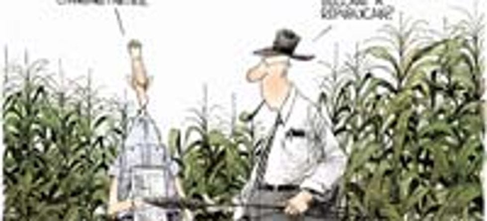 Finally, we come what's truly the most exciting image that anyone could come up with about any political issue, ever: two guys commenting wryly about it at as they read about it in the paper, while standing in the middle of a cornfield! The corn indicates that these are good, honest Iowans who are about to get gay married. Dude on the right is holding the enormous metal marital dildo that he's been saving for this precious day of freedom.