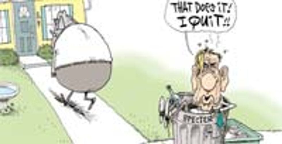 Here you have a mostly unrecognizable, and thus helpfully labeled, Arlen Specter. He's been taken out by the GOP andput in the trash can!Now he's sitting in a can of festering garbage, with rotting banana peels and apple cores, andflies,andstink lines.I guess those Republicans showed him, huh? And now he's trying to make some sort of claim that he's the one who quit, but we all know that he didn't, that theRepublicansthrew him out in a move to clean house, right? Right? That's how it went down? Oh, wait, it didn't? This cartoon has no basis in reality at all? Oh, all right then.