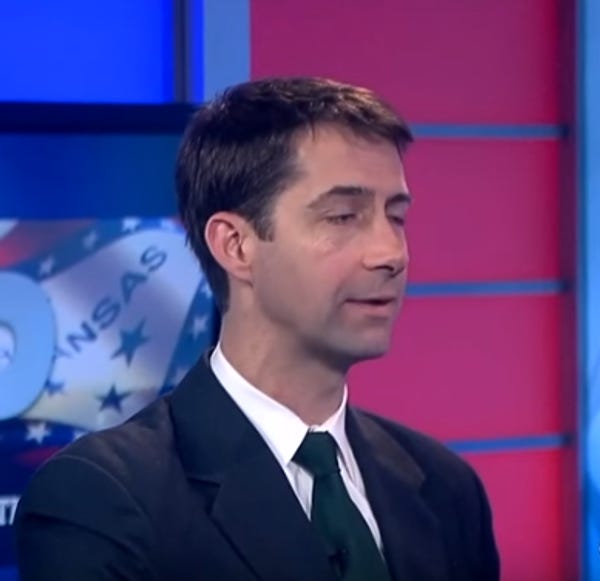 Tom Cotton, he is this shitbrick GOP senator from Arkansas who doesn't think for himself and lives inside Donald Trump's asshole, next to last night's Big Macs. He has ALWAYS been a shit. He was a shit back when President Obama was negotiating the Iran nuclear deal, taking it upon himself to send his own GRRRR letter to Iran about how Obama isn't even president, therefore Iran should just listen to him , a lowly redneck senator from Arkansas who doesn't know his muh-fuckin' place . He is an embarrassment to his home state, which just so happens to be yr Wonkette's home state too! Indeed, we have heard #ArkansasRumors that, much like Ted Cruz, literally everybody has hated Tom Cotton his entire life, because he is that much of a sniveling shit.
