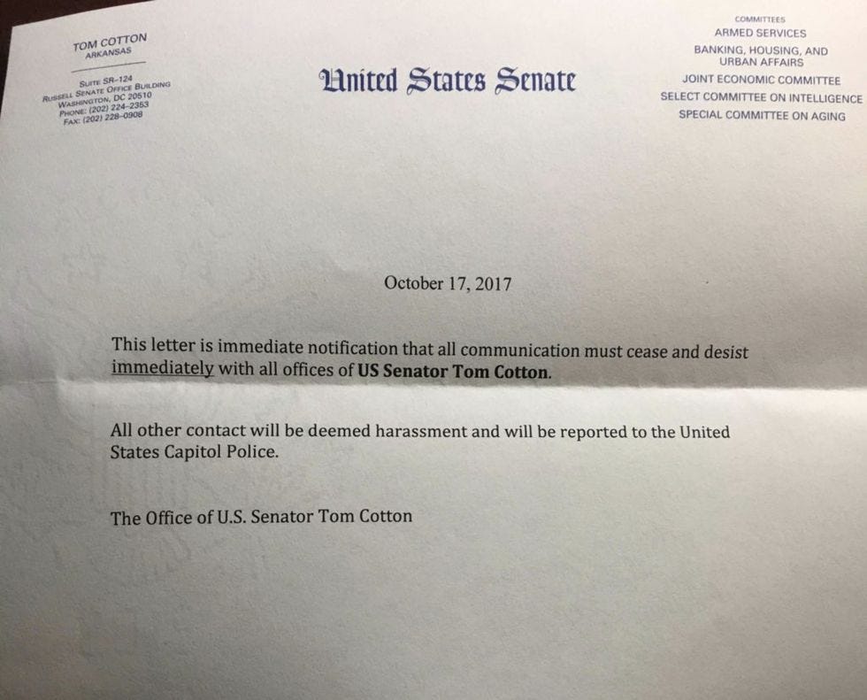 This letter is immediate notification that all communication must cease and desist immediately with all offices of US Senator Tom Cotton.