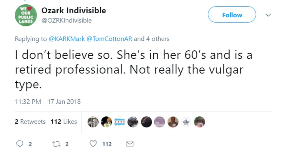 (And Wonkette, again, doesn't support threats, but we wouldn't be bothered if Ozark Indivisible cut the crap and stood in front of Cotton's office with signs that say, "WHO YOU THINK YOU WORK FOR, YOU RANCID LITTLE FUCK TROLL?" Would that be "vulgar"?)