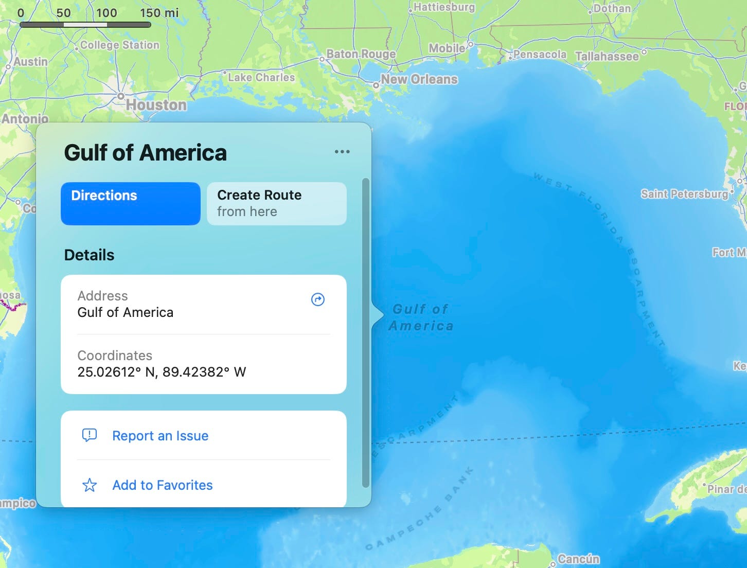 Oh, the stupid of it all. Trump can executive-order name changes to whatever federal lands and bodies of water inside the US that he wants to. He can call Denali Mount McKinley, or rename Mount Rushmore Mount MAGA or rename Lake Michigan The Kid Rock Basin of Liberal Tears. But the Gulf of Mexico, which has been called that even before there was a USA, borders two other countries, and international waters only extend 12 miles out to sea.