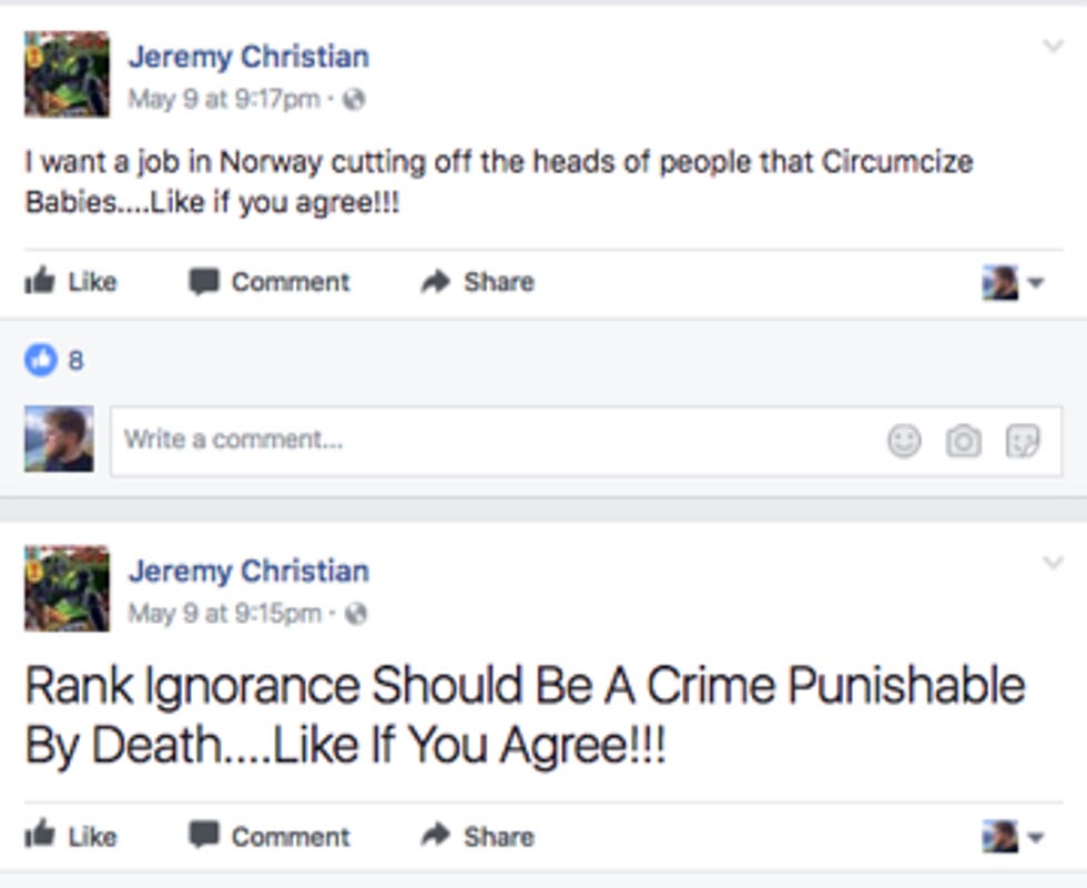 Christian's Facebook page was found to be filled with racist memes, hate speech, anti-semitism and all manner of vile grossness.