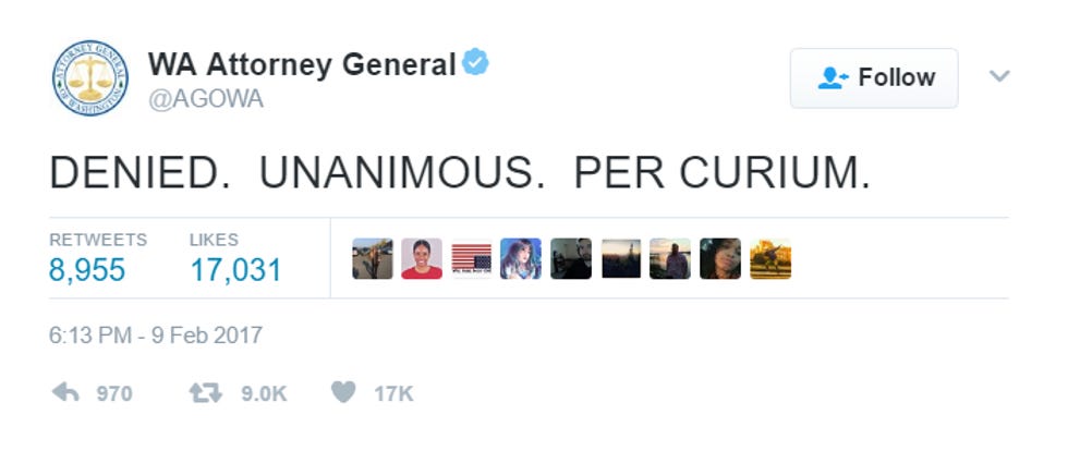 Here's what the Washington attorney general's Twitter (blue check mark and everything!) thinks about how the appeals court ruled in the state's case: