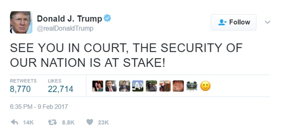 WEIRD BREAKING NEWS, but it seems like more "so-called judges" think Donald Trump's Muslim ban is terrible and bad and should eat dicks. A panel of the U.S. Court of Appeals for the Ninth Circuit has ruled that the hold that nice judge in Washington placed on the Muslim ban will remain, handing weak, sad Donald Trump another big loser loss on the first big thing he tried to do as "president":