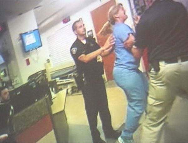 Kids, it's another of those stories where we need to remind you not to hurl your computer, tablet, or phone across the room. If you're reading at work, you may want to make sure you can muffle your curses as you proceed. A Salt Lake City nurse was illegally placed under arrest, with excessive force, by a Salt Lake City police detective who dragged her off to jail -- for the crime of explaining that, no, hospital policy (and a 2016 decision by the Supreme Court) prevented her from drawing blood from an unconscious accident victim, even though the detective really, really wanted the blood sample and insisted he needed the blood sample because he's a cop. The Salt Lake Tribune explains: