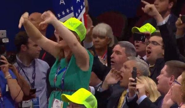 Clear enough! And as it turned out, NeverTrumpers led by Nevada Sen. Mike Lee, former Virginia attorney general Ken Cuccinelli, and Colorado delegate and MSNBC fixture Kendal Unruh managed to get signatures from a majority of delegates from eight states plus the District of Columbia, which should have been enough to force a roll-call vote. All they had to do was get them to the convention secretary, Susie Hudson, who had become strangely difficult to locate. Eventually the NeverTrumpers' petition carrier, former New Hampshire Sen. Gordon Humphrey, got the petitions to her. But instead of a roll-call vote, the rules came up for a voice vote, which the acting convention chair, Arkansas Rep. Steve Womack, decided did not go in the NeverTrumpers' favor. And that was that! Chaos on the floor, screaming and tears, and chants of "Roll Call Vote!" that were far more passionate and coordinated than any of the sad attempts at "U.S.A.! U.S.A.!" that came later in the evening.