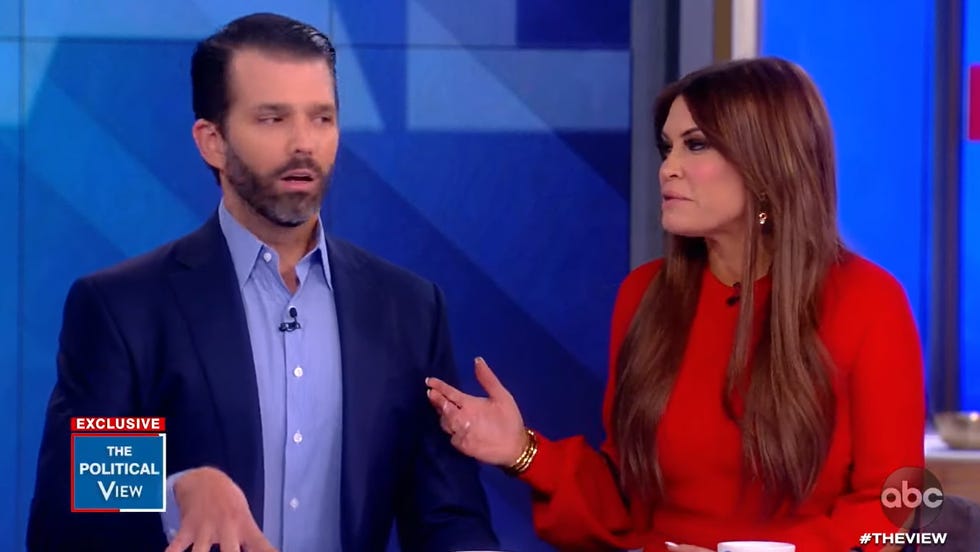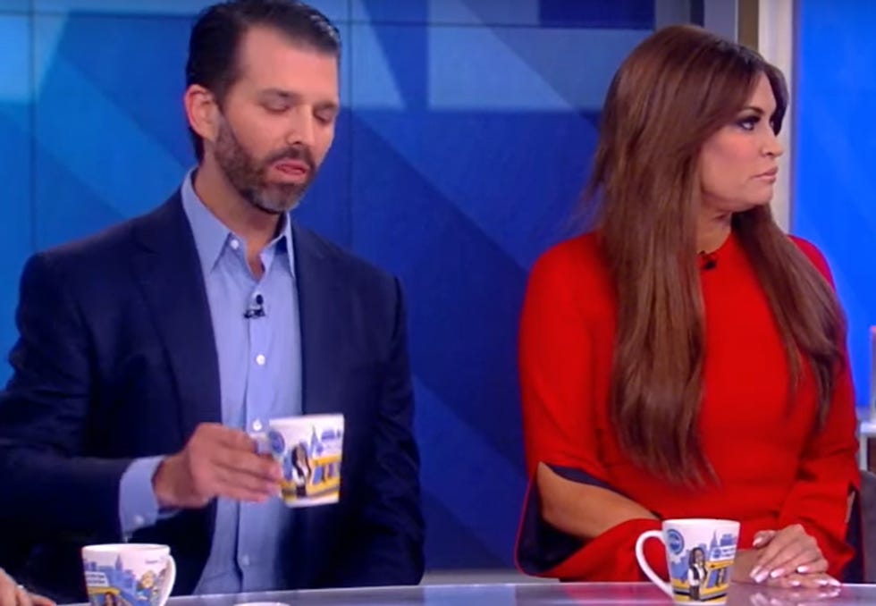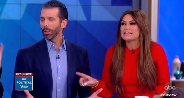It's the end of the day, so we should all sit around the campfire and watch America's sweethearts on "The View." We are obviously talking about Donald Trump Jr. and Kimberly Guilfoyle -- he, the man, who left his former wife who is the Duchess of Marinara Sauce and went straight to the arms of she, the woman who used to AirDrop the Fox News studios with pix of his D-I-K, allegedly.