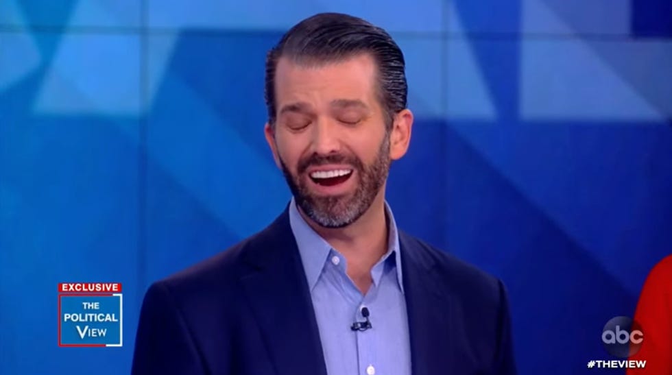 Everybody laughed at Junior for daring to go after Hunter Biden for benefiting from nepotism and Junior just lied a lot about his family not making money off the presidency for approximately 100 minutes and then Whoopi rang her bell to shut them up (did we mention she had a bell?) and Junior shared his thoughts on the Democratic primary and he said "you have no idea how many Democrats come up to me" and say nice things about his dad (this is a lie) and BLAH BLAH "PC culture" and BLAH BLAH "leftists" and BLAH BLAH Abby Hunstman decided to end on a "light note" by asking these two crazy kids "When you getting married HUH?" because obviously we all are just wondering when Kim Guilfoyle is going to make an honest man out of Diapers McGrossface, that'll be the royal wedding we never fuckin' watch, and Junior said his greatest sacrifice on the campaign trail for his dad is traveling with Kimberly Guilfoyle (???) and Guilfoyle ended their appearance on "The View" by saying she is Hispanic and Trump is awesome.