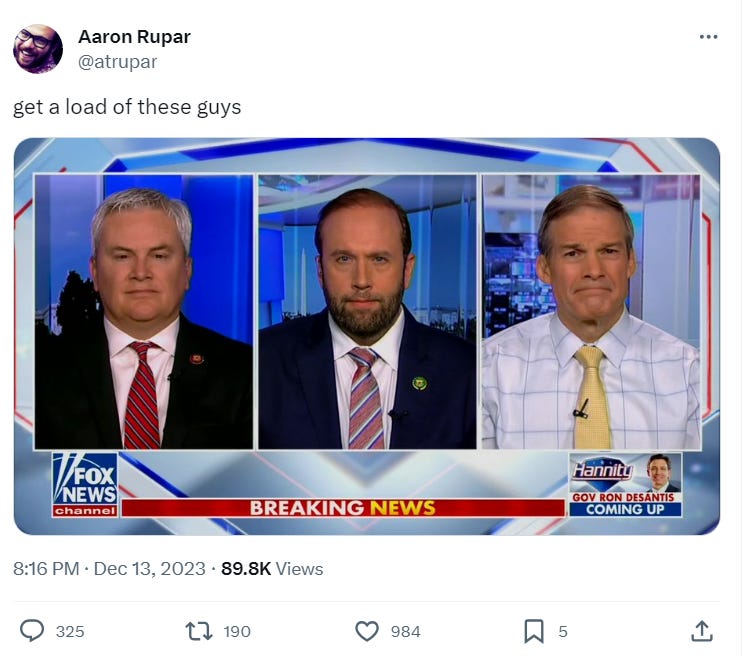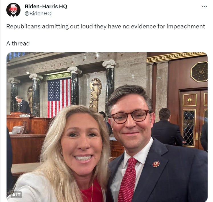 Last night, all House Republicans voted for this travesty. For what high crimes and misdemeanors? They don’t know. They will figure out a reason sometime, or would it work for you if they won’t? Can they just impeach him for “I know you are but what am I?” and can we accept that Republicans aren’t serious people, are not beloved by our Lord, and they’re just going to do this shit as long as they’re allowed near power?