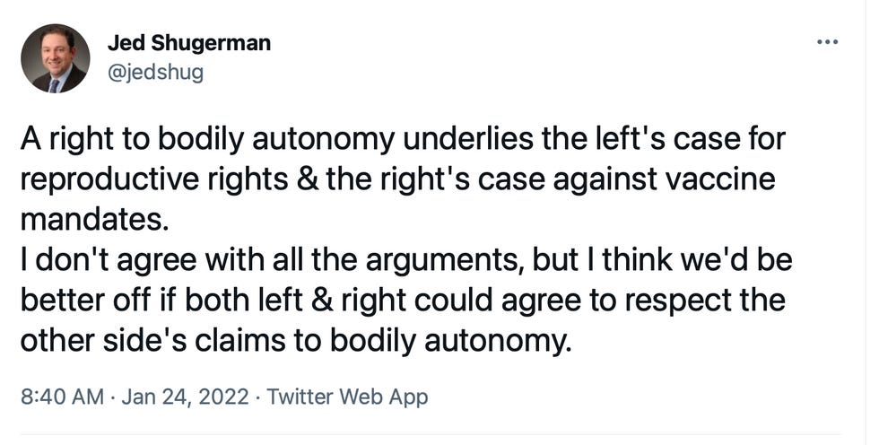 He tweeted this week: "A right to bodily autonomy underlies the left's case for reproductive rights & the right's case against vaccine mandates. I don't agree with all the arguments, but I think we'd be better off if both left & right could agree to respect the other side's claims to bodily autonomy."