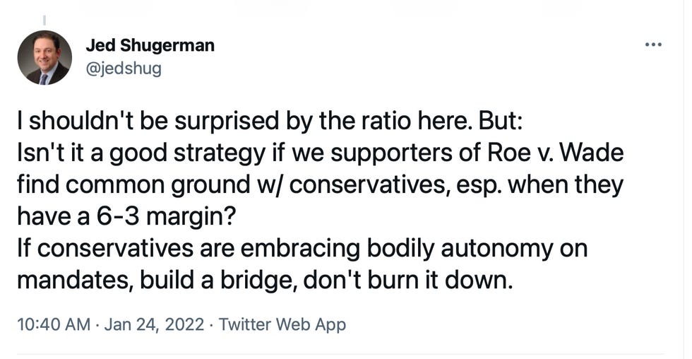 But: Isn't it a good strategy if we supporters of Roe v. Wade find common ground w/ conservatives, esp. when they have a 6-3 margin? If conservatives are embracing bodily autonomy on mandates, build a bridge, don't burn it down.