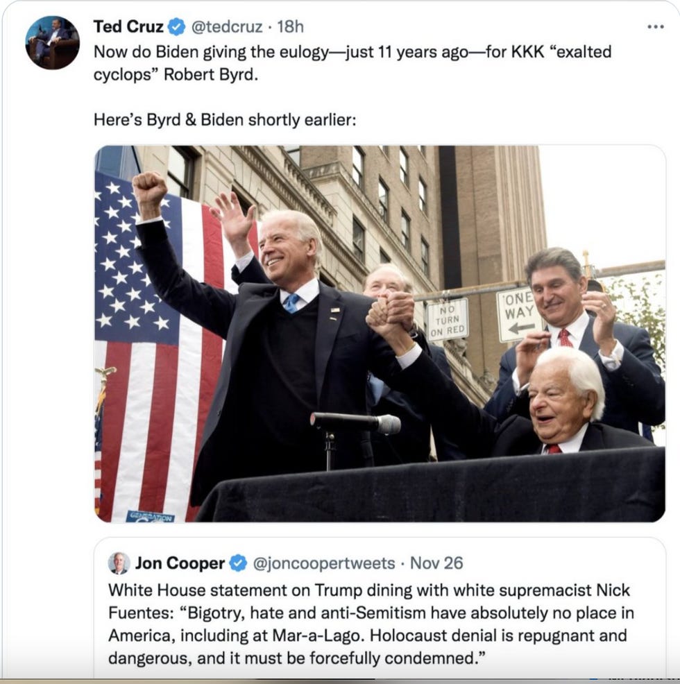 Meanwhile, Ted Cruz didn’t hesitate to degrade himself on Trump’s behalf. When the White House issued a statement denouncing Trump’s dinner with Ye and Fuentes — “Bigotry, hate, and anti-Semitism have absolutely no place in America, including at Mar-a-Lago. Holocaust denial is repugnant and dangerous, and it must be forcefully condemned" -- Cruz churlishly responded, “Now do Biden giving the eulogy — just 11 years ago — for KKK 'exalted cyclops' Robert Byrd.” He even had a staffer dig up a photo of Biden with Byrd and Joe Manchin.