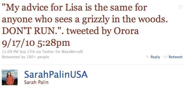 At first this looked like Sarah was retweeting somebody but didn't understand how to use those buttons. But there is no "Orora" on Twitter that wrote this. So is this Orora person someone who's allowed to use Palin's BlackBerry? Is she the ghost-tweeter? And is this implying Joe Miller is a "Mama Grizzly" too? So Joe Miller is a woman? Also, isn't staying in an election the same kind of inaction as standing still when one sees a bear? This is all very confusing.