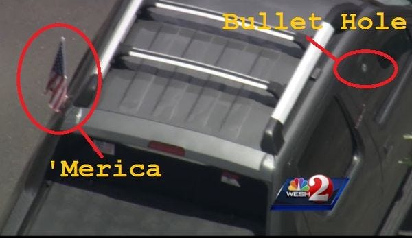 In breaking "Everyone saw This Coming" news, we learn that Second Amendment Hero George Zimmerman suffered minor injuries in a shooting incident Monday afternoon in Lake Mary, Florida. Lake Mary Police Chief Steve Bracknell said that Zimmerman was not badly hurt in the incident, which apparently involved Zimmerman and one other man. News video shot from a helicopter showed a bullet hole in the passenger-side window of Zimmerman's pickup.