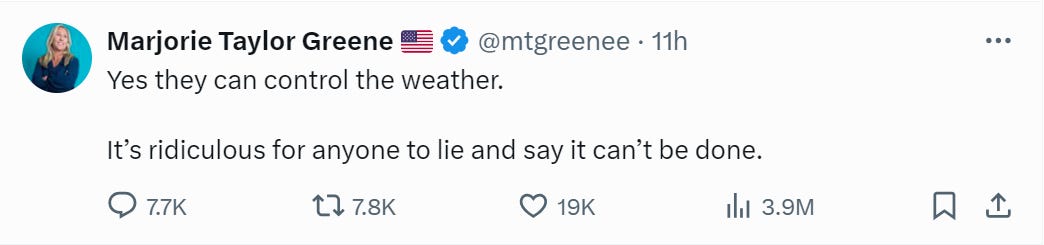 Yes, in the horrific wake of Hurricane Helene, North Georgia’s finest mind was on the Website Formerly Known as Twitter suggesting that some mysterious cabal had purposely sent the hurricane spinning across the South, killing a couple of hundred people, wiping out small towns, and causing billions upon billions of dollars in damages. For what purpose? Well, to steal the election, obviously.