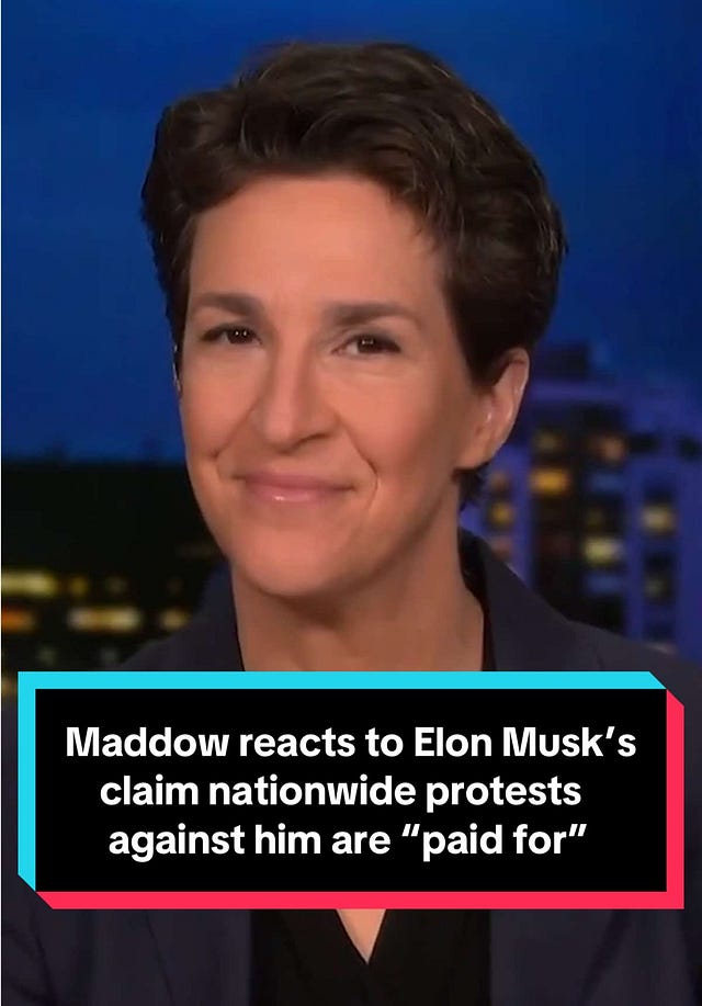 But his saddest, funniest delusions came when he started blaming “paid” protesters for all his woes. Or, alternately, he said they’re all just people who love all the fraud he and DOGE are definitely eliminating. (Elon has found zero fraud. He has found things he and his team of unfuckable dorks don’t understand, and he has found things he and his Nazi president want to murder because they in their incredible ineptitude and bigotry think they are “woke” or “DEI.”)
