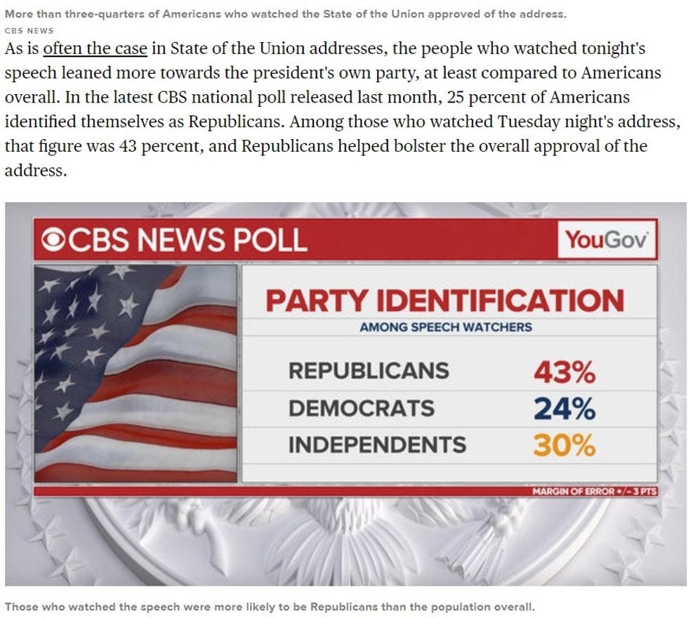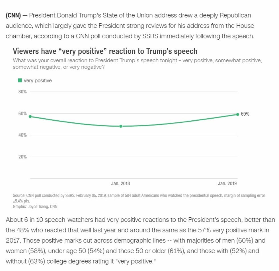 CBS NEWS POLL: 76 percent of viewers approved of what they heard in Pres. Trump's #SOTU speech; 72 percent said the… https://t.co/4uJk8YC6Mk