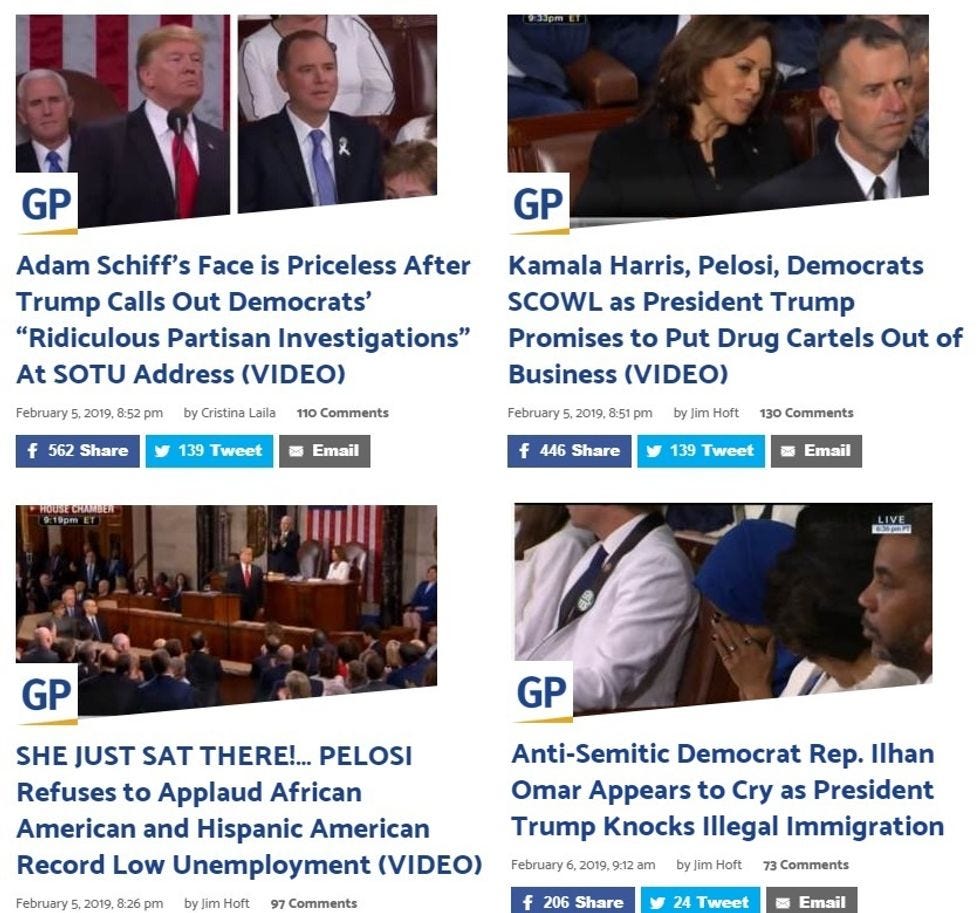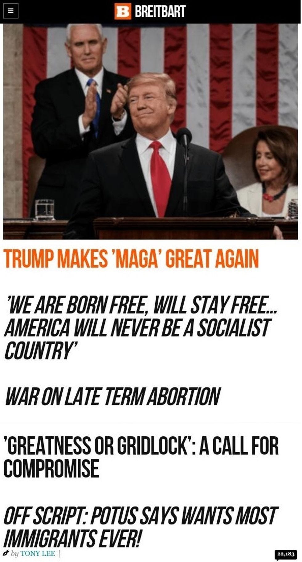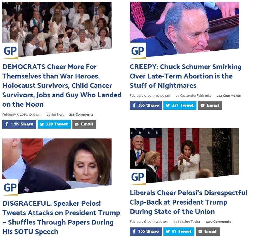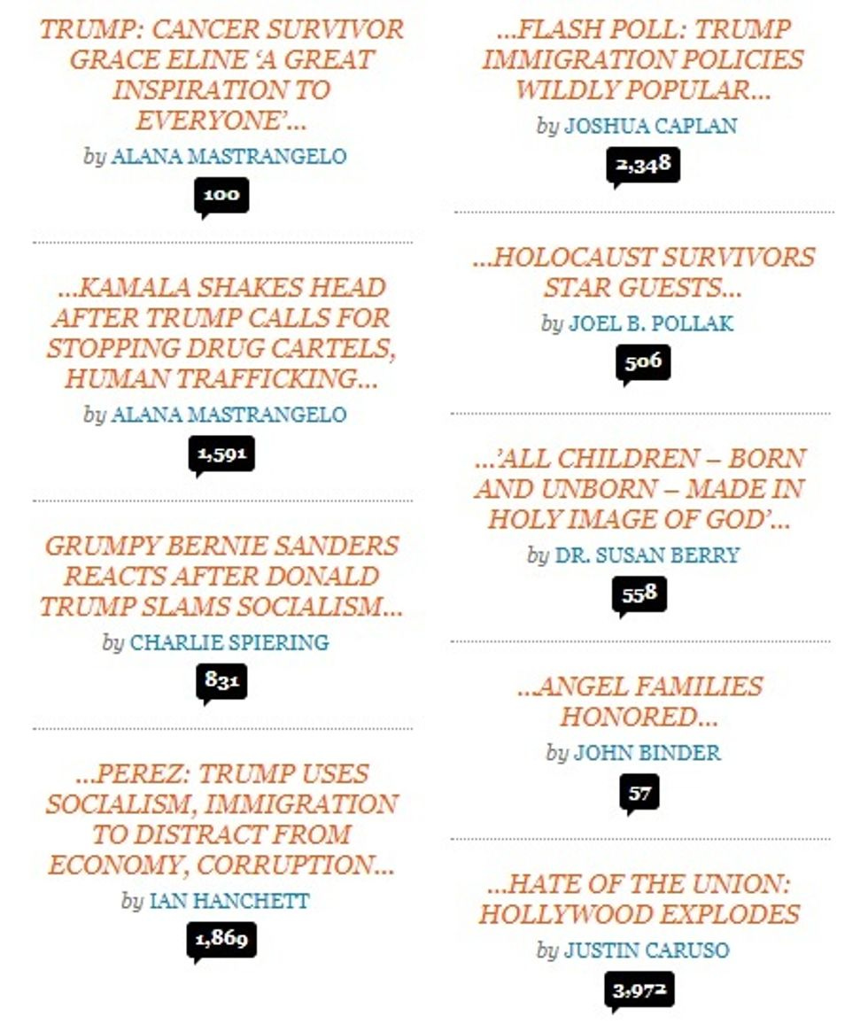 Those aren't links -- that's the headline and subheads for a single article. Breitbart's SOTU coverage included upbeat articles about the Holocaust survivor at the speech, the little girl with cancer, parents of those murdered by rampaging illegal immigrants, and Trump's pledge to make women carry all fetuses to term after the second trimester, even the ones that will immediately die, for Jesus. Looks like the commenters far preferred the red meat offerings, though -- just look at the comment counts for pieces on the villains!