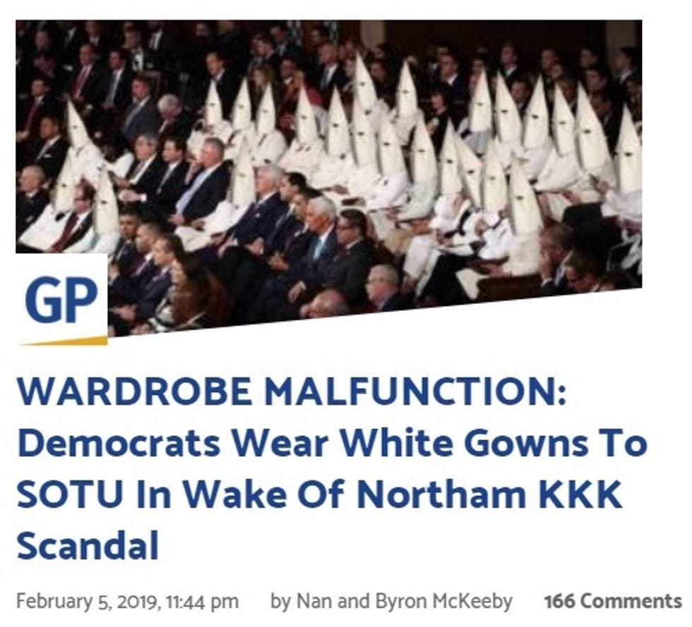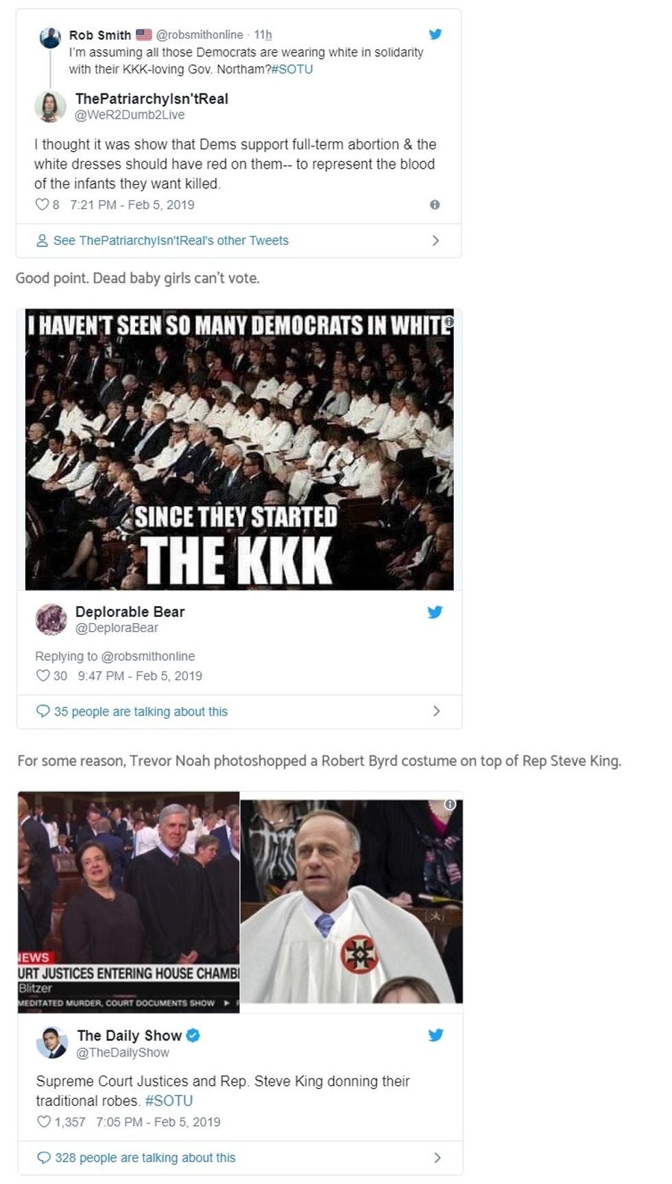 Fortunately, the Gateway Pundit still has THIS funny collection of tweets about how those dumb Democrat ladies were all dressed in white -- like KKK members, and did you know Democrats did the KKK?