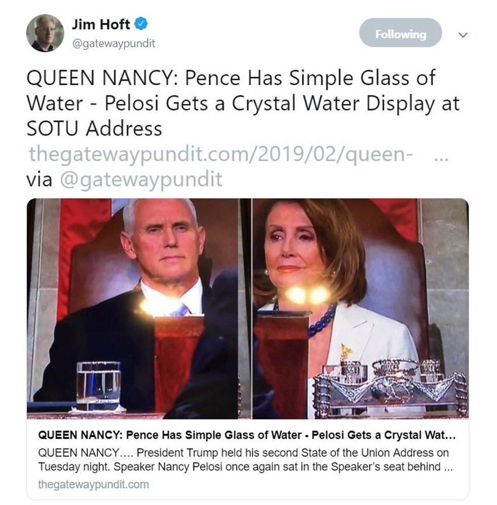 Oh, yes, and the Stupidest Man on the Internet, Gateway Pundit's Jim Hoft, got his readers all upset about that fancy "crystal water glass" setup Nancy Pelosi had in front of her. That would be the 200-year-old ink stand that's on the Speaker's desk every damn year. Then this morning he deleted the article.