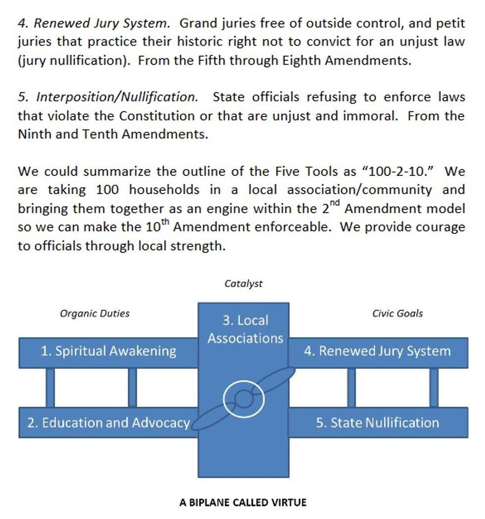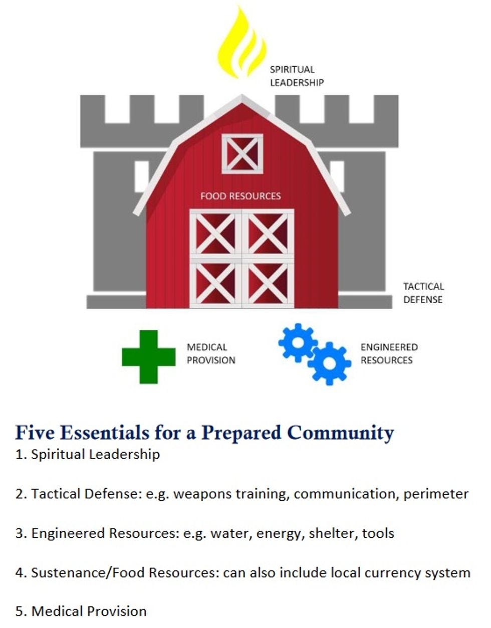 As prepper loons go, they're only interested in surviving the End of Civilization, not bringing it about, which is a relief. They have little patience for your Sovereign Citizen types, and asked a woman at one of their meetings to leave after she questioned the legal authority of local police, who she insisted were all given authority by "a corporation," and were therefore less legitimate than self-constituted militia, which are ordained by the Bible and the Constitution. And like lots of fundagelicals, they have a penchant for weirdass graphics, like this thing from their little manifesto: