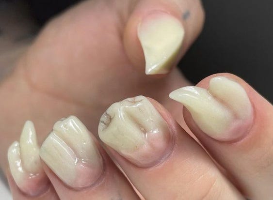 Watch, if you dare. We only made it about two minutes before noping out, but we can at least guarantee her teeth are nicer than the goofy artificial nails in our featured photo up top.