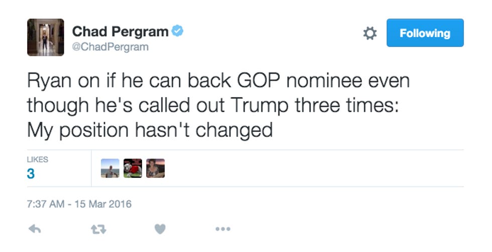 [contextly_sidebar id="iMuDc5uKakzspZToQcYzLQWoySz2TnXe"]Should we flashback thingy to make sure we are correctly remembering Ryan's position on whether he will bend over, grab his ankles, and say "Thank you sir, may I have another?" in support of the unacceptable unprincipled awful violence-inciting Donald J. Trump, should he win the party's nomination? Nah, why even bother. We all know exactly where brave Speaker Ryan stands when it comes to standing up to the party's new daddy , which is exactly where Donald Trump tells him to be, like all the others. Good boy, Paul Ryan. That's a good little speaker.