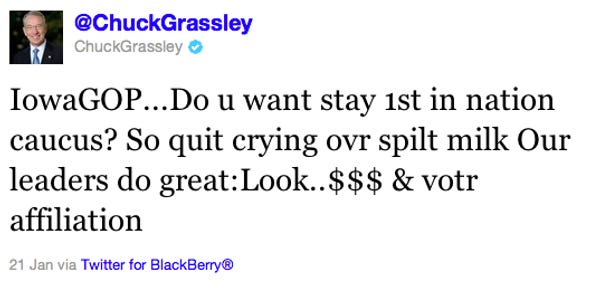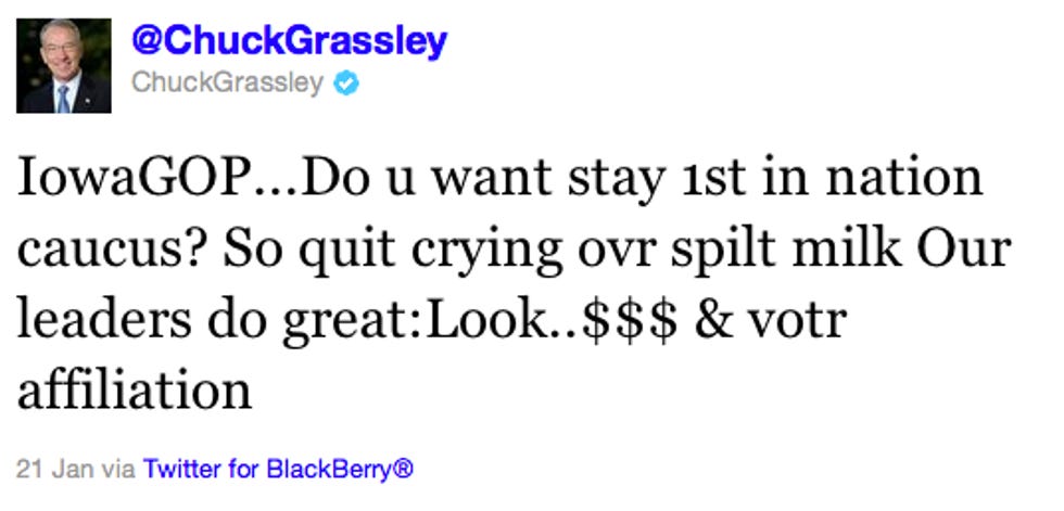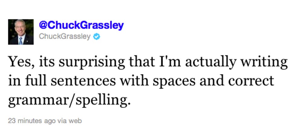 Oh well, and now all trace of coherency has been wiped from Chuck Grassley's Twitter feed, and the world is safe again. SRY EVRY1 NO WORRY @LL back 2 how it shud b! [Twitter]