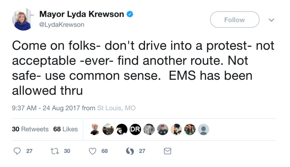 So here's the mayor of St. Louis tweeting at her constituents, and note the date because this was AFTER Charlottesville: