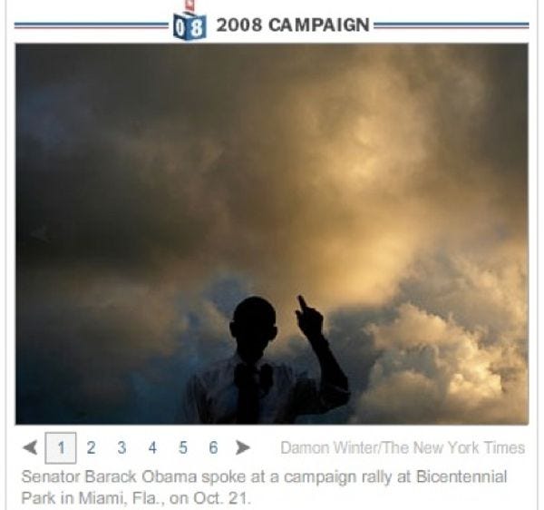 Whoa, jesus,New York Times, what are you peopletrying to sayhere, with this terrifying photograph of Barack Obama shaking his head with dignity as the world burns? Did McCain get the nuke suitcase? Oh noes! [ New York Times via Wonkette commenter The NeoSkeptic ]
