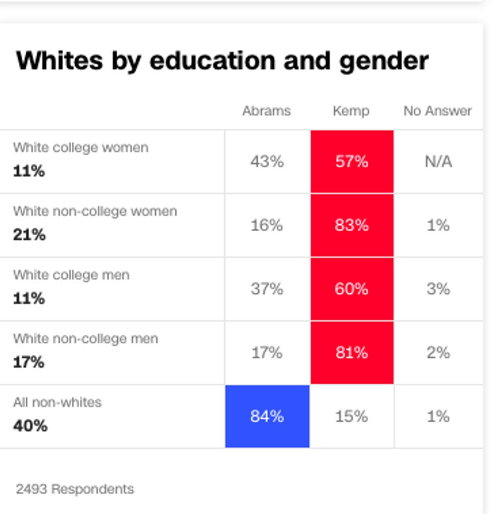 But close examination of the Georgia governor's race raises some concerns. White voters collectively showed Abrams the back of their hands with middle fingers extended. This surprised our college friends who didn't know anyone who'd vote for Kemp other than their parents and everyone at their church. But Abrams argues that Democrats can build on her tremendous success with black voters while making inroads with suburban white women. She also makes clear she's not the only candidate who can deliver black voters to the polls.