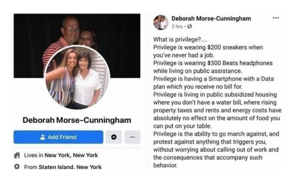 Morse-Cunningham earns $130,000 a year as New Dorp High's assistant principal. That's well above both the average and median household incomes in Staten Island, so the lady knows something about privilege. Her Facebook post was public (this is why she's an assistant principal), so a parent saw it and started a Change.org petition to have her ass fired.